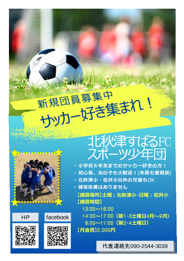 | 活動時間 | 北秋津小学校 第1、3土曜日 14:00~17:00(4〜9月) 13:00〜16:00(10〜3月) 第2・4土曜日 8:00〜11:00 松井小学校(日曜日) 通年 13:00〜16:00 |